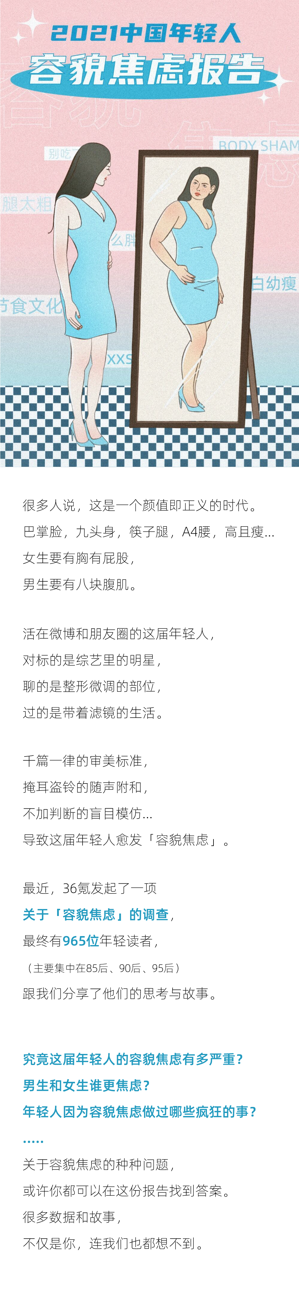 2021 - 08 - 07在这个看脸的时代,无数年轻人掉进了“颜值即正义”的陷阱。我们每个人似乎变得越来越容易焦虑,拼了命想靠近那一个千篇一律的审美标准。 《听见她说》这部剧中的女主角如是反问: 「什么是美、什么是丑,是谁定义了这样的标准。这样的标准又是为谁定义的。我没有质疑高白瘦,我质疑的是‘一定’。我不完美,完美多苍白;我很完美,完美地成了自己。」 这一连串的灵魂拷问无一不在直击着我们的内心,到底是什么导致我们活在单一的审美标准里,把自己严丝合缝塞进别人制造的模具里? 欣慰地是,我们看到越来越多的年轻人意识到这个问题,也开始尝试与自己的容貌焦虑和解。 其实,无论是健身、化妆,还是整容,都只是一种选择。追求美是人类的天性,并没有对错褒贬,也没有高低贵贱之分。但区别在于你要意识到你是发自内心想要变得更好,还是只是受困于某种单一审美标准的病态焦虑之中。 在文末,我们也一起来看看,这届年轻人是怎么用实际行动和自己的容貌焦虑和解的: 本文来自微信公众号“后浪研究所”(ID:youth36kr),作者:Linny 崔永旺,36氪经授权发布。
