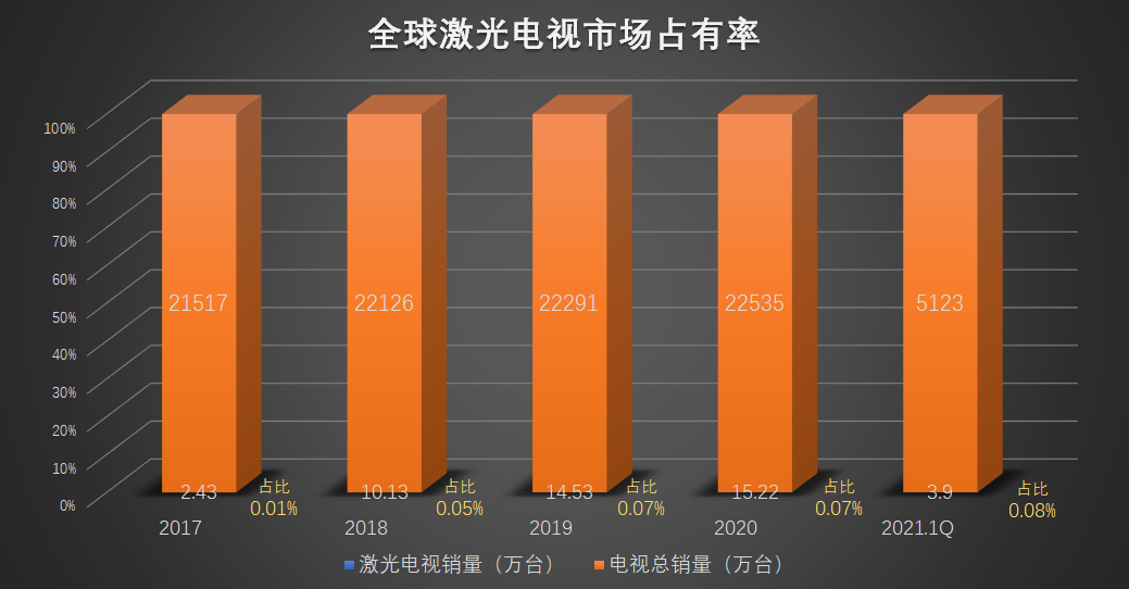 尤其是与其宣传声量相比,激光电视明显属于“雷声大雨点小”。Omdia数据显示,全球激光电视近年来的确在快速增长,但市场占有率一直在0.1%以下,2020年仅为0.07%,今年一季度仅为0.08%。