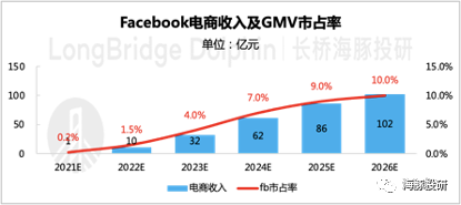 b.电商收入只估算Facebook在美国地区的情况。按照10%的市占率,对2026年Facebook电商GMV达到2030亿美金,按照公司所称的5%的变现率转化为收入。