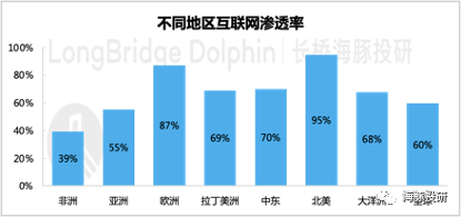 首先来算一下整体市场的空间,IWS数据显示截至2020年6月,全球互联网渗透率近60%,不同的地区,渗透率水平如下: