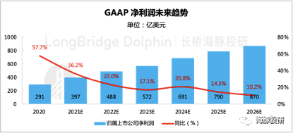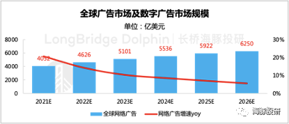根据UnivDatos预测,对未来5年数字广告的市场规模将以7.7%的年复合增速增长,到2026年将达到6260亿元,海豚君对该增长趋势进行了平滑测算。