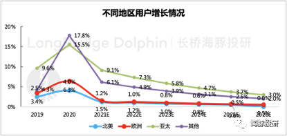 当然,对应四大地区,用户增长情况差异是比较大的。总体来讲,未来用户规模的拉动更多的是靠亚太及其他地区。