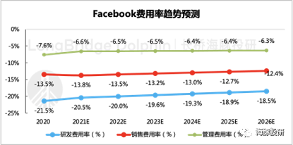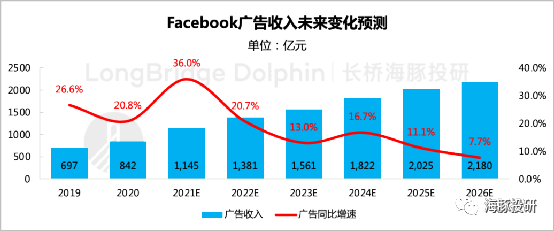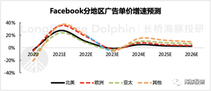 (1)对于广告业务,海豚君基于IMF等国际机构对未来中短期宏观经济的走势判断,对Facebook广告量、价分别进行了推演假设(不代表真实走势),也就是说,未来6年广告收入的年复合增速在17%。2026年Facebook的广告收入占整体数字广告市场的35%,较当前25%有显著提升。