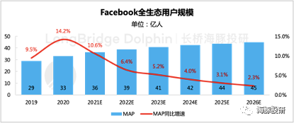 则FB家族app的整体用户规模有望达到85亿*75%/46.5亿*33亿=45亿人,相比2020年33亿的MAP,年复合增速为5.3%。