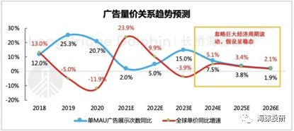 基于以上GDP预测以及历史广告量价与GDP增速之间的关系,海豚君对未来5年的广告量价做了简单预测(疫情假设2023年之后未出现较大的经济波动,整体广告收入按增速趋势进行线性测算)