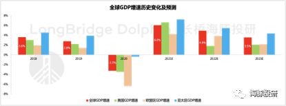 海豚君结合IMF、高盛等机构的预测,预期今年下半年开始,经济增速将逐渐环比放缓。2021-2022年可以说是一个经济相对复苏的周期,后年2023年则开始回到原先正轨(低增速稳态)。具体各地区未来1-2年的增速预测如下: