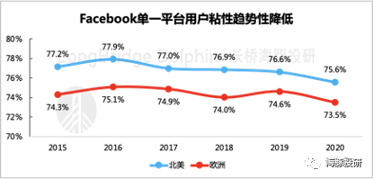 当然,这个趋势在通信基建设施更好的欧美发达地区表现得更明显。直接反映在Facebook上,就是带来用户时长或用户粘性的降低。如下,我们选取DAU/MAU代表用户粘性指标,可以看出欧美地区的用户粘性一直在缓慢下滑,尤其是TikTok短视频大放异彩的2020年,FB的用户吸引力在加速下滑。