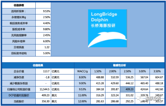 基于以上投资逻辑和假设,海豚君按照WACC=9.53%,g=2.5%的折现,给予Facebook 1.16万亿估值,合409美元/股,较美东时间8月4日收盘356美元,存在15%的溢价空间。