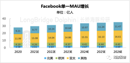 如果假设5年后的2026年,全球互联网渗透率水平能够提升至75%(当下菲律宾、俄罗斯等国水平),那么在FB全生态护城河未受到较大影响下(市占率不变)。
