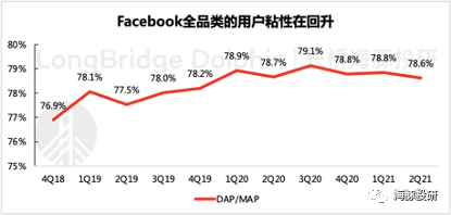 因此Facebook仍然有机会追赶。在陆续推出Watch、Reels等视频平台或功能之后,全品类的用户粘性并没有如Facebook单一平台那样下滑。