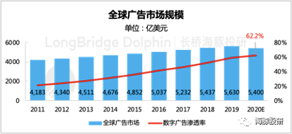 从Statista统计的2020年数据来看,整体广告市场大约为5400亿,网络广告渗透率为62%。