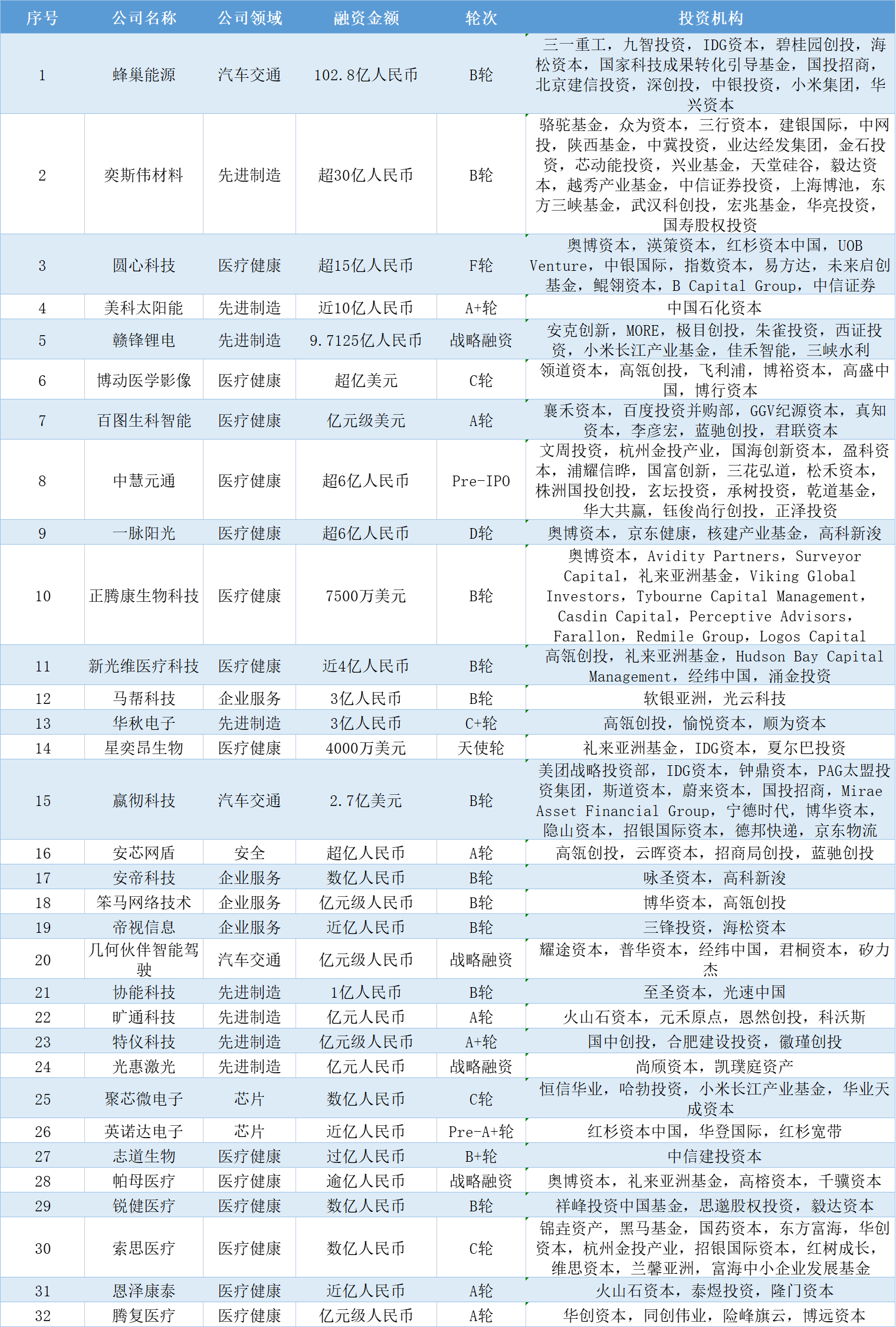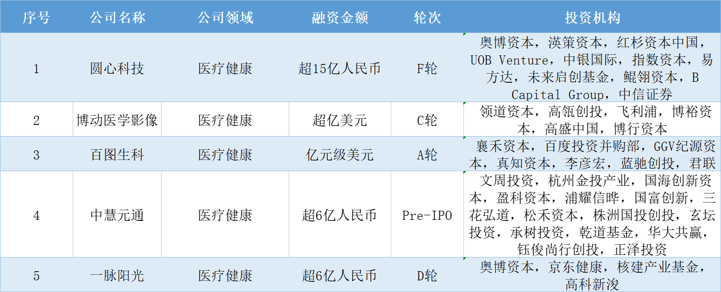 本周融资金额过亿的交易共有32笔,主要集中在医疗健康领域,如圆心科技,单笔融资超25亿元。