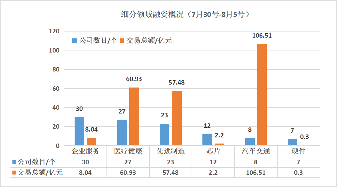 本周(7.30~8.05)国内共发生114起融资事件,较上周119起环比下降4.2%;近一周交易总额超238.60亿人民币,较上周81.84亿人民币环比增长191.5%。