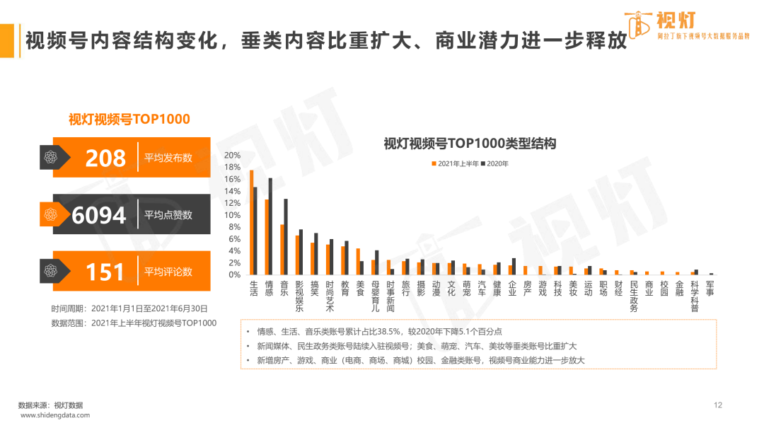 视灯报告显示,2021 年上半年,视灯视频号榜单 Top1000 中,企业认证号占比 20%,较 2020 年提升了 4%,垂类账号以房产、健康等类型居多。