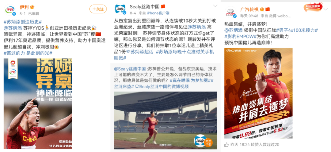 在过去一年中,苏炳添曾和伊利、耐克、广汽传祺、Sealy丝涟中国等多个品牌达成合作。凭借着比赛成绩带来的巨大话题性和美誉度,品牌也迅速将与苏炳添有关的广告内容推送至头条。