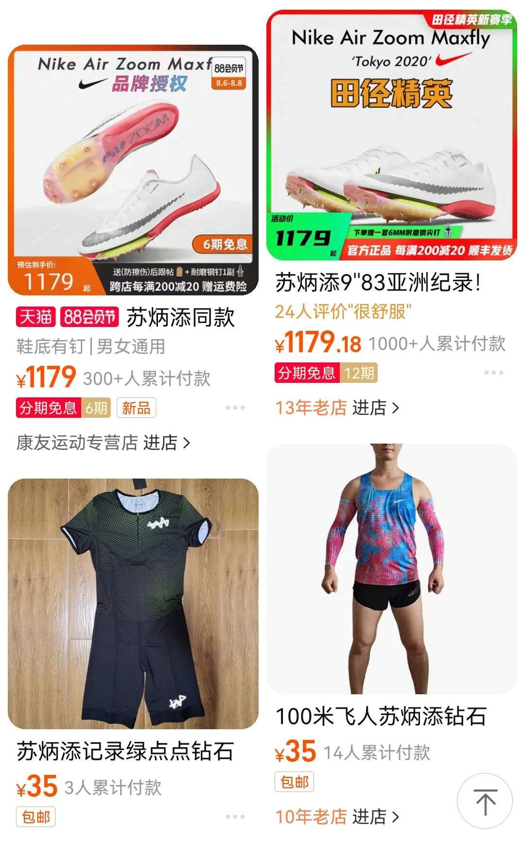 热度从传统品牌溢出到零售业。在淘宝搜索“苏炳添”,不乏相关品牌在商品标题上蹭热度,甚至与其本人并不那么关联的淘宝店铺,也纷纷标上“苏神”“奥运”等关键词,用以招徕顾客。