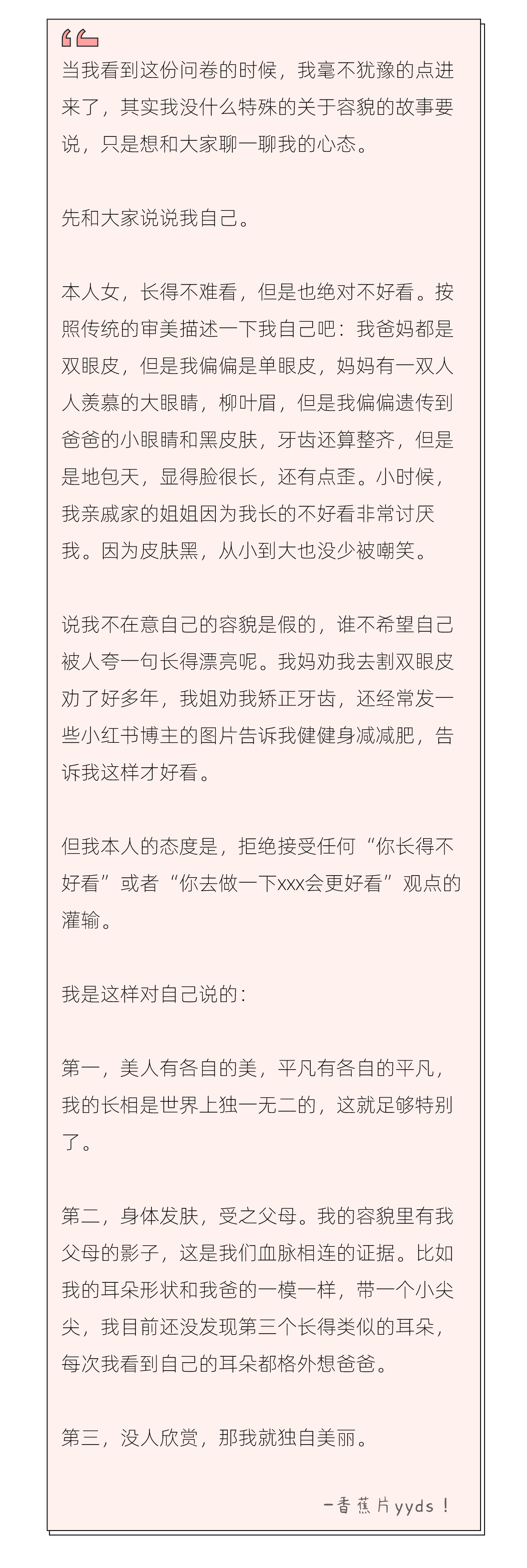 「什么是美、什么是丑,是谁定义了这样的标准。这样的标准又是为谁定义的。我没有质疑高白瘦,我质疑的是‘一定’。我不完美,完美多苍白;我很完美,完美地成了自己。」